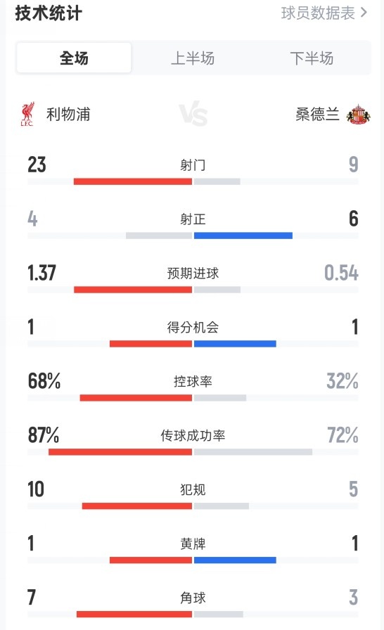 利物浦1-1桑德兰全场数据:射门23-9,射正4-6,控球率68%-32%