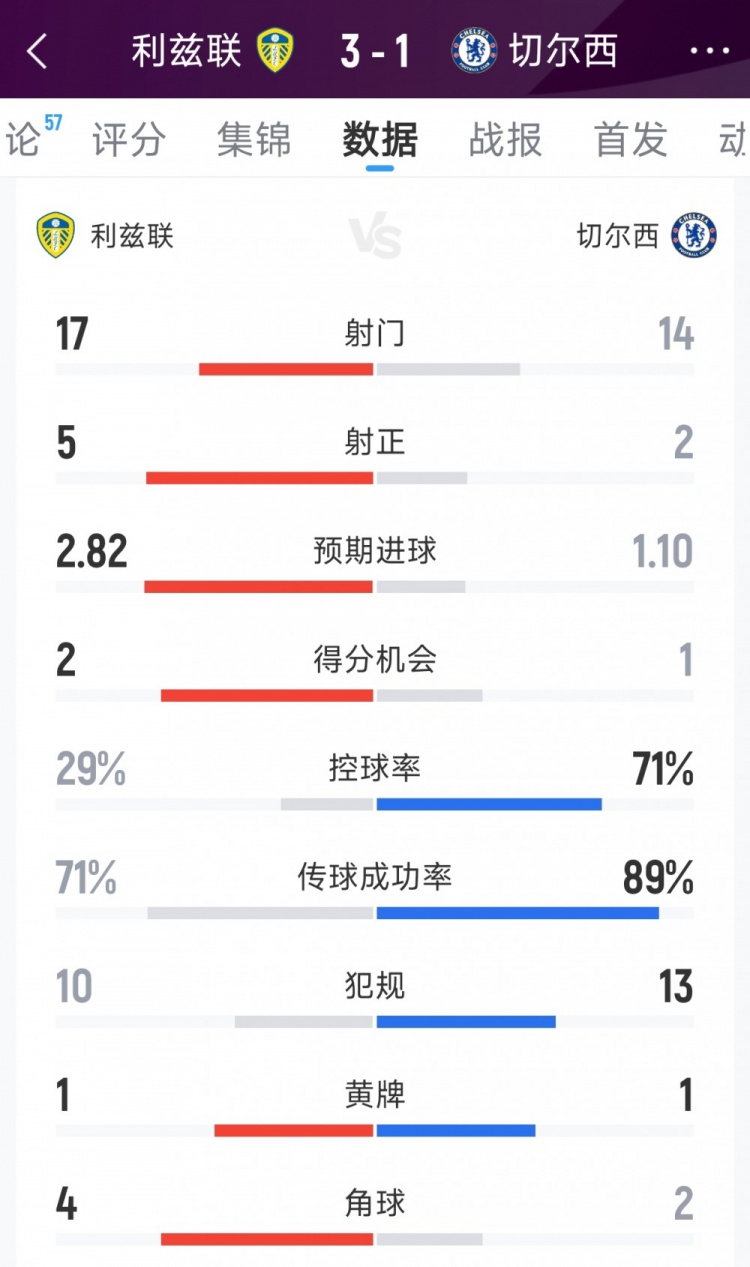 利兹联3-1切尔西全场数据:射门17-14,射正5-2,控球率三七开