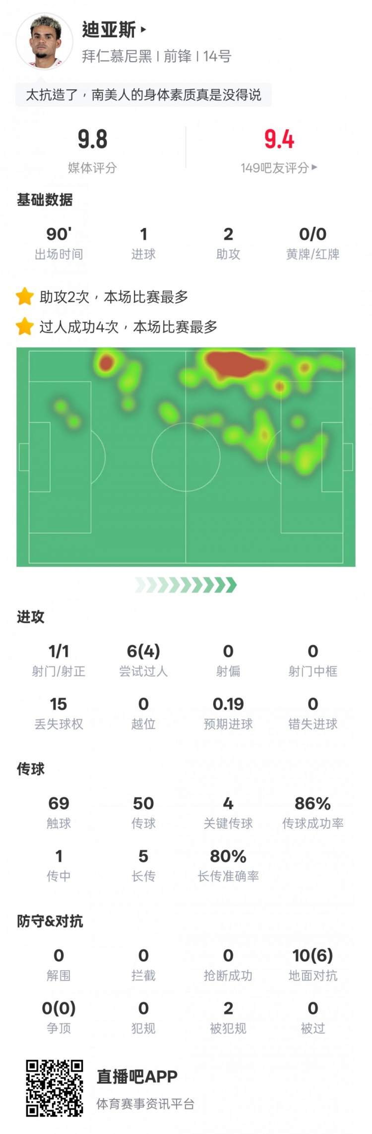 路易斯-迪亚斯本场数据:1射2传&4过东说念主到手4要津传球,评分9.8