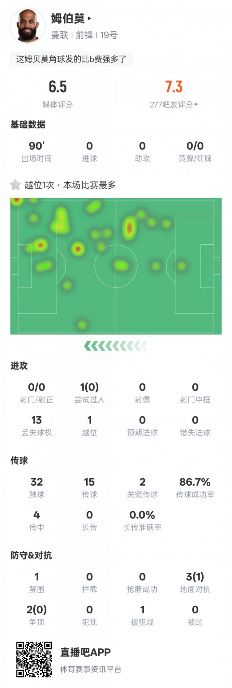 姆伯莫本场数据:2环节传球1突围&13次丢失球权,评分6.5
