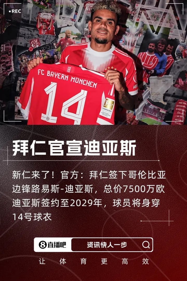 路易斯-迪亚斯示意:“我额外幸福,成为拜仁慕尼黑的一员对我来说真谛要紧,这是宇宙上最大的俱乐部之一。我但愿凭借我的足球立场和个性来匡助我的新球队。我的宗旨是取得悉数可能取得的冠军。为此,咱们将行动团队每天使勇应允。”