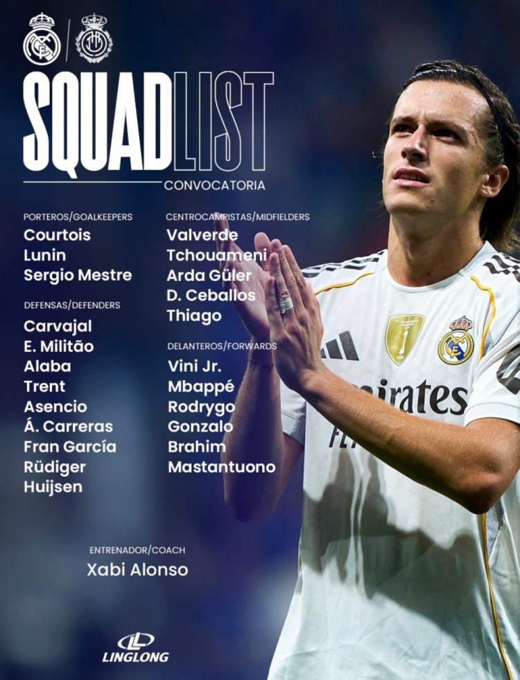 8月29日讯 皇马将在第三轮西甲迎战马洛卡,球队官方也公布了本轮比赛大名单,贝林厄姆、卡马文加、门迪和恩德里克继续缺席。具体如下: