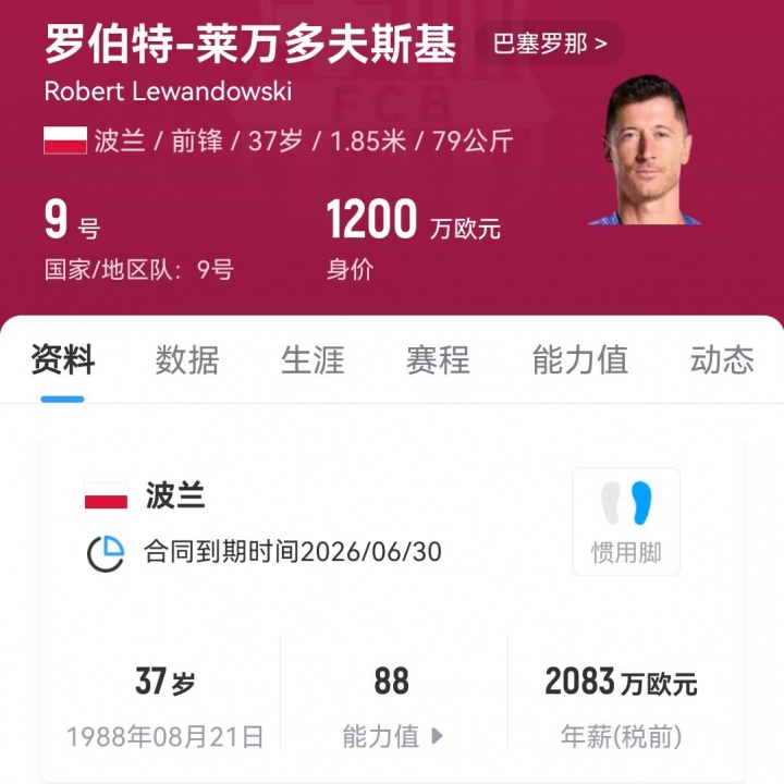 09月30日讯 现在37岁的莱万多夫斯基现在与巴萨的协议还是参预终末一年,将于2026年6月30日到期。