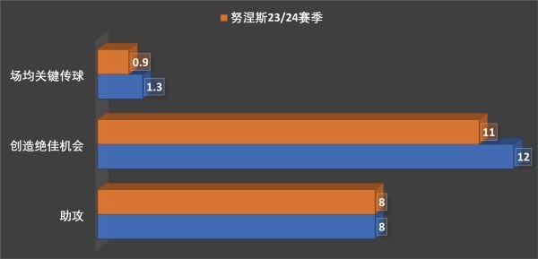 不外哪怕是努涅斯在利物浦的最好赛季,在传球方面的推崇依旧比埃基蒂克要失神一些。上赛季德甲赛场,埃基蒂克不但有8次助攻,更是送出12次绝佳得分契机,更是场均有1.3次关节传球。