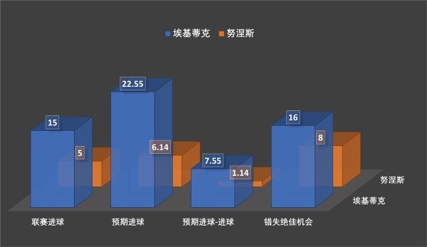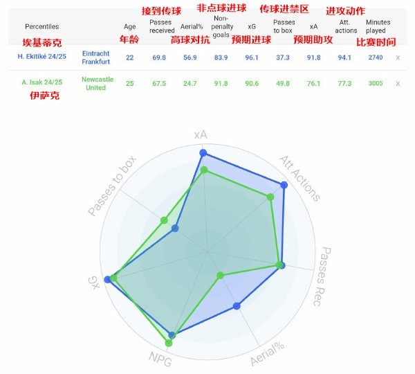 要是将埃基蒂克与伊萨克进行对比,除了进球推崇,以及传球进禁区数据处于劣势除外,埃基蒂克其他方面齐是最初的。