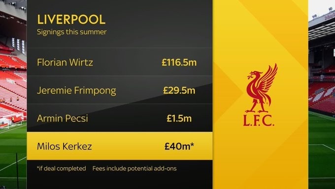 仍是官宣的4名新援消耗了利物浦2.13亿欧元转会费,埃基蒂克入队后,开销势必杰出3亿欧元。要是还有格耶和罗德里戈,那么转会费总开销将会险峻4亿欧元大关。