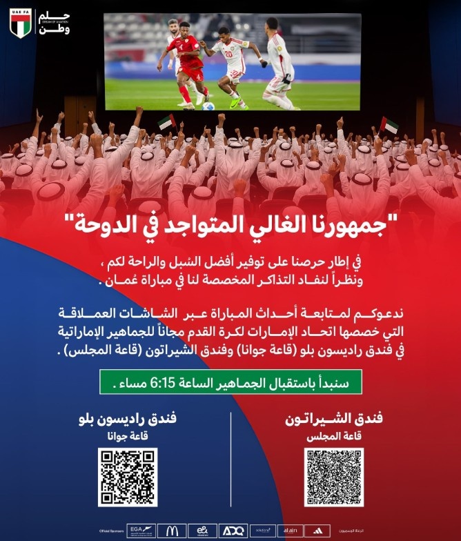 咱们邀请您在阿联酋足球协会为阿联酋球迷免费提供的位于丽笙酒店(乔安娜厅)和喜来登酒店(马吉祥斯厅)的巨型屏幕上怜惜比赛动态。咱们将于18:15(22:15)运转招待公众。”