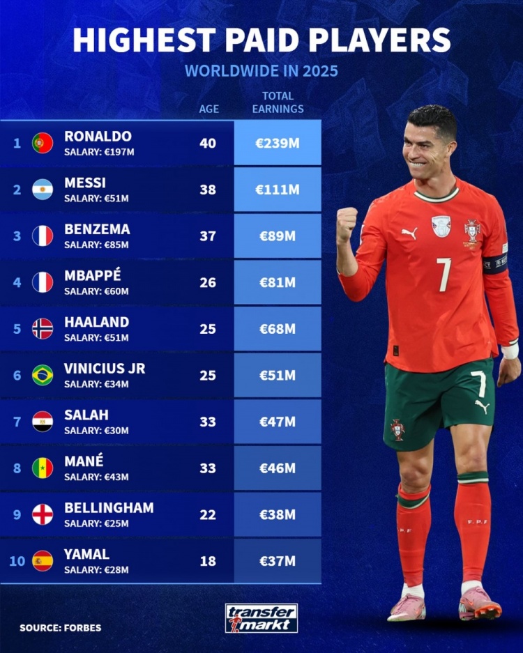 2025年球员收入名次:C罗2.39亿欧居首,梅西1.11亿欧次席
