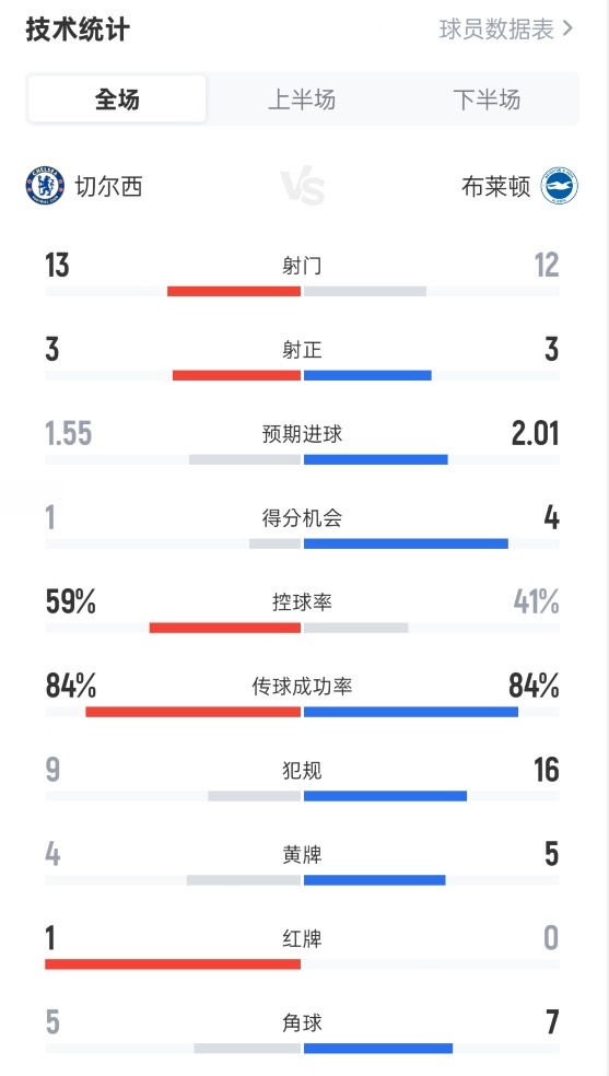 切尔西1-3布莱顿全场数据:射门13-12,射正3-3,控球率59%-41%