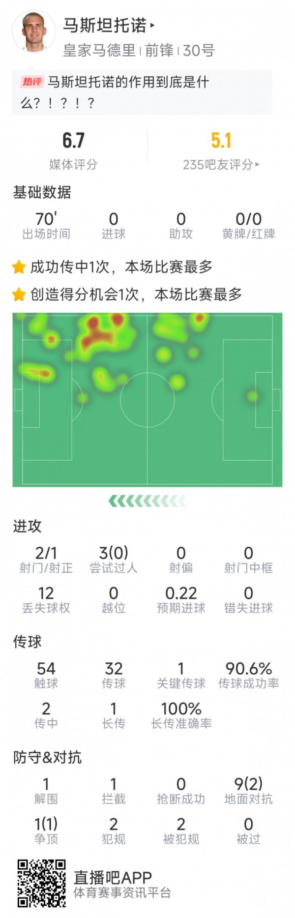 马斯坦托诺本场数据:0球0助,2射1正,1次重要传球,0生效过东谈主
