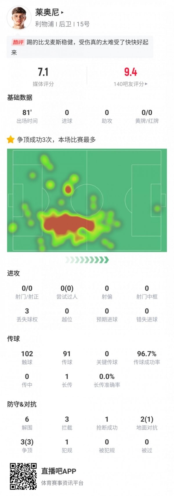 莱奥尼利物浦首秀数据:出战81分钟伤退,6次突围3次防止3次争顶