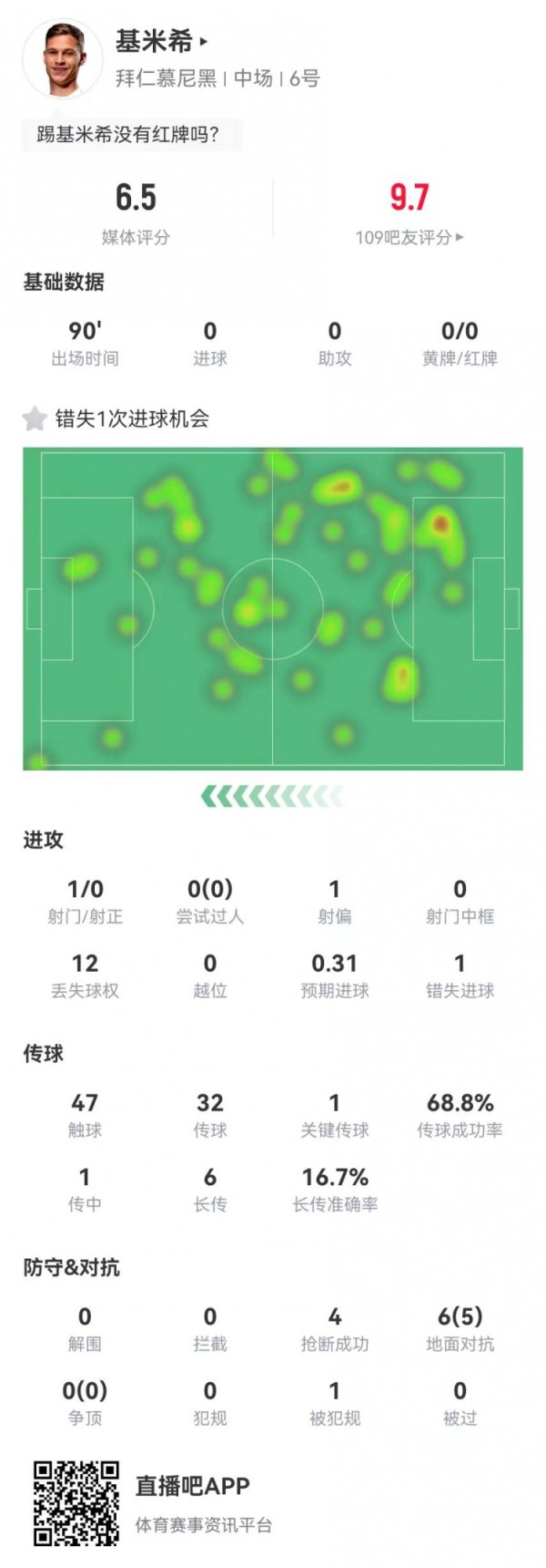 基米希本场1射1失良机+1错误传球 4抢断+6抗拒5得胜 仅获6.5分