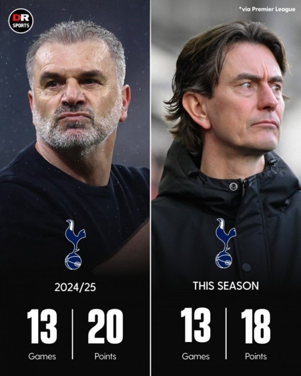 得益欠安!弗兰克抓教热刺本赛季13轮18分,比上赛季同时还少2分