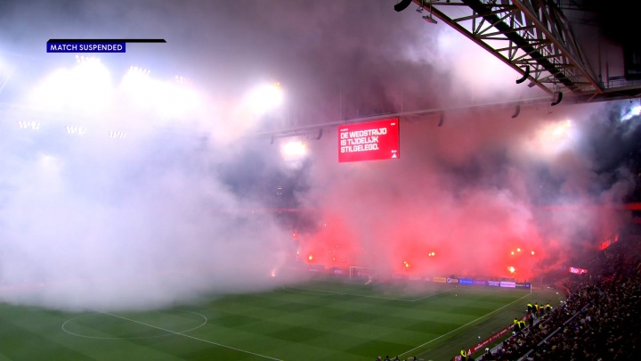 阿贾克斯与格罗宁根的比赛在今晚仅进行了五分钟。由于死忠球迷看台(球门后方)燃放了深广烟花,球员们那时不得不奔走着离开球场。