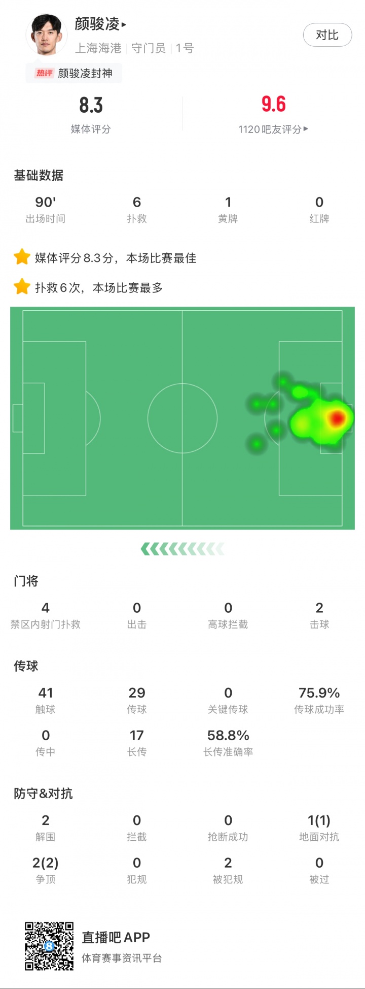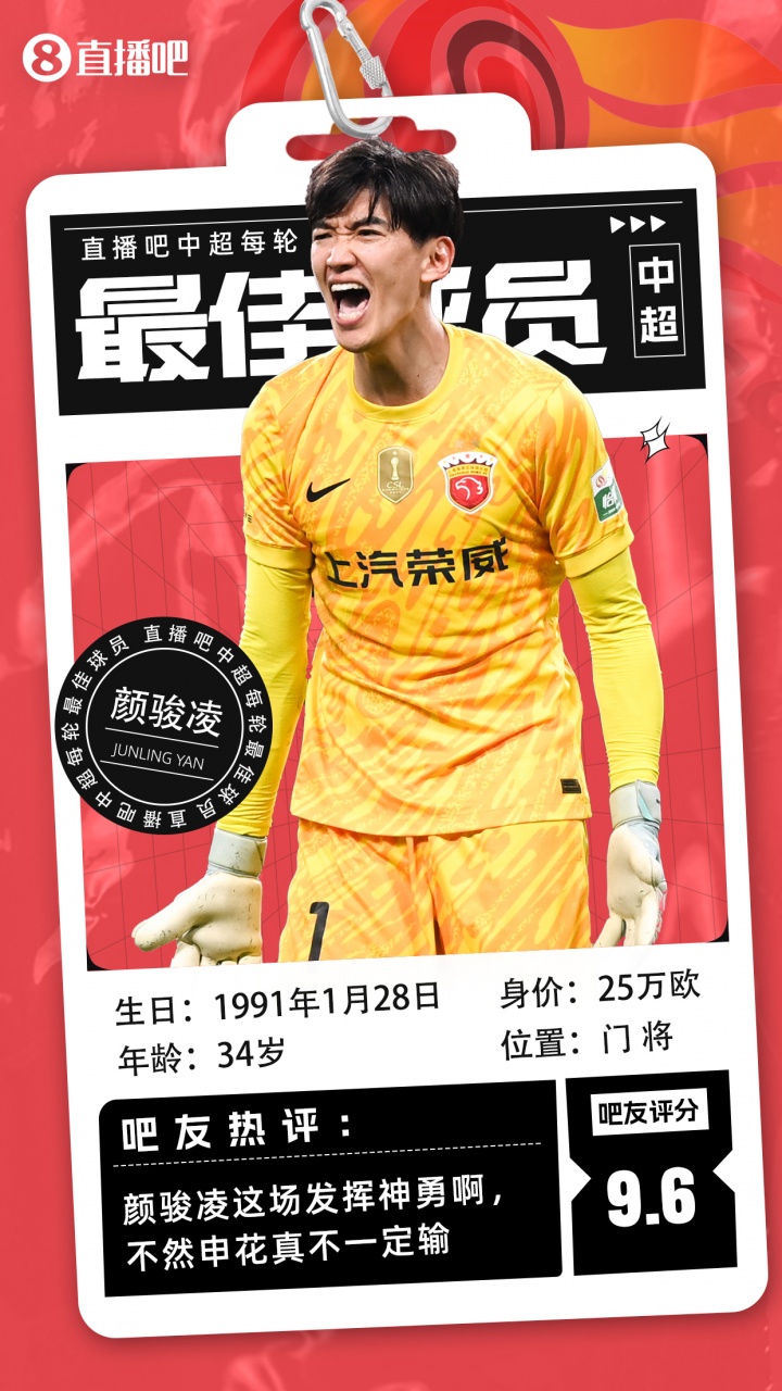 【】中超第20轮最好球员评比出炉,34岁颜骏凌当选本轮最好!颜骏凌在上海德比6次扑救封神,匡助上海海港在客场2-1打败上海申花。