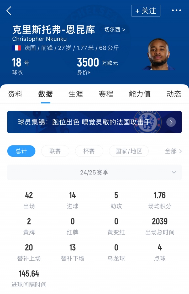 恩昆库于2023年夏天从莱比锡加盟切尔西,条约握续至2029年。上赛季他在各项赛事中出场42次,攻入14球,但仅在英超联赛首发出场9次。