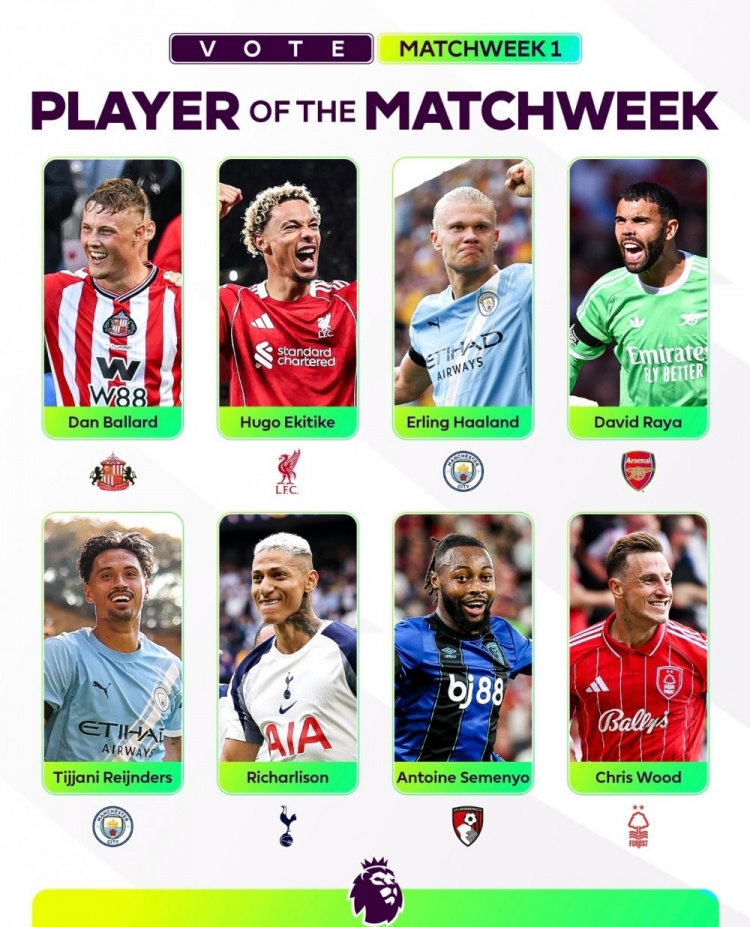 英超官方首轮最好球员候选:哈兰德领衔,埃基蒂克、理查利森在列