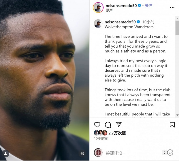 7月31日讯 狼队边卫塞梅多将加盟费内巴切,他更新社媒动态,与狼队告别。