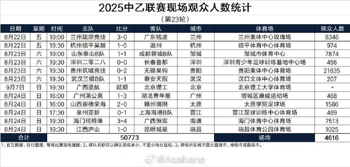 2025中乙联赛现场不雅世东谈主数统计(第23轮)(1场脱期)