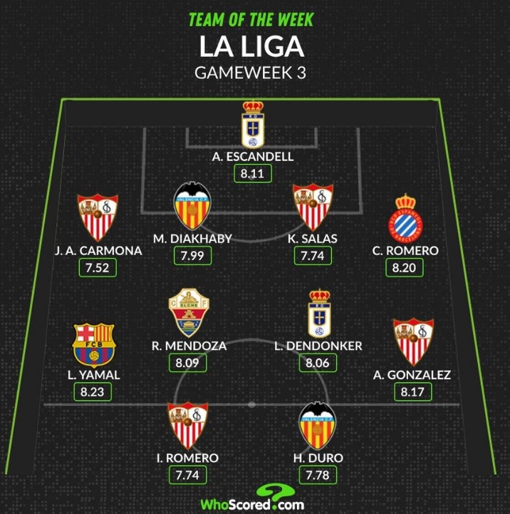 Whoscored评本轮西甲最好阵:亚马尔领衔,塞维利亚4将入选