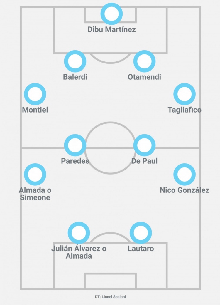 附《奥莱报》算计阿根廷队首发:大马丁;蒙铁尔、巴雷尔迪、奥塔门迪、塔利亚菲科;阿尔马达/小西蒙尼、帕雷德斯、德保罗、尼科-冈萨雷斯;阿尔马达/阿尔瓦雷斯、劳塔罗