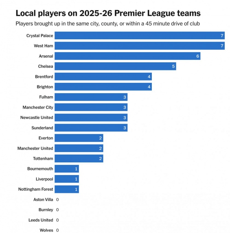 英超各队土产货球员东谈主数(球队场所地同城、同地区、距离俱乐部45分钟车程的土产货球员)