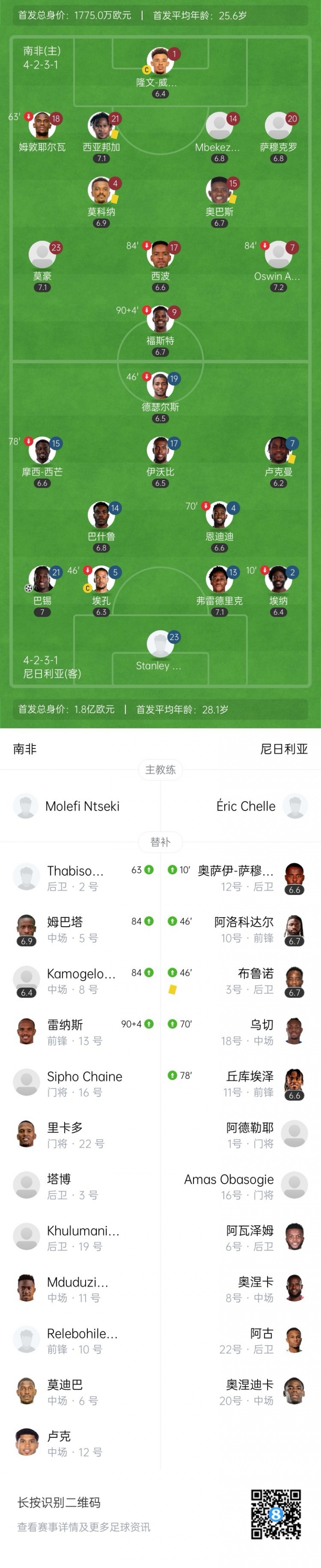 本场比赛,固然身价7000万欧的奥斯梅恩伤缺,但尼日利亚全队身价仍有1.8亿欧,首发有伊沃比、卢克曼。比赛第25分钟尼日利亚后卫埃孔乌龙,第44分钟贝西破门,之后两边再无建立,最终战成1-1平。