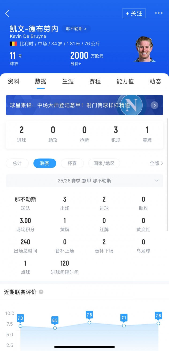 34岁的德布劳内也在本年夏天登陆意甲,他加盟那不勒斯后出战3轮意甲打进2球,匡助卫冕冠军3连胜领跑意甲。
