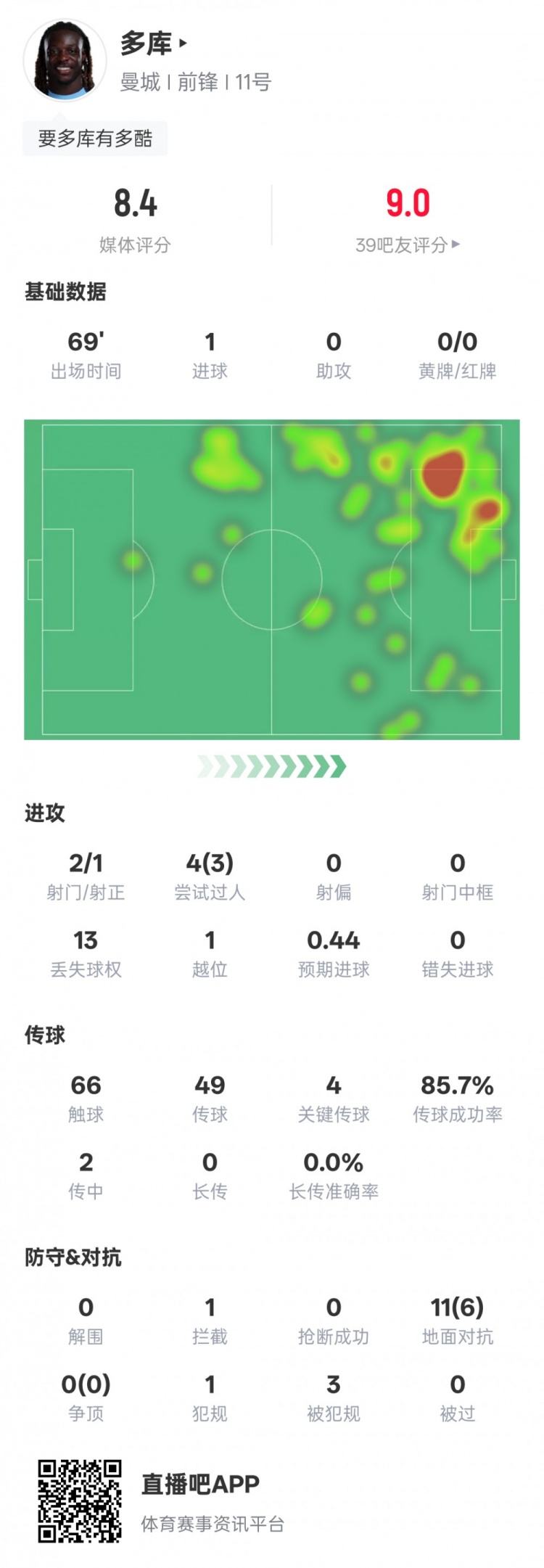 9月19日讯 欧冠联赛阶段第1轮,曼城对阵那不勒斯,多库首发出战,孝顺1粒进球,送出4次要津传球,4次过东谈主3次告捷,评分8.4。