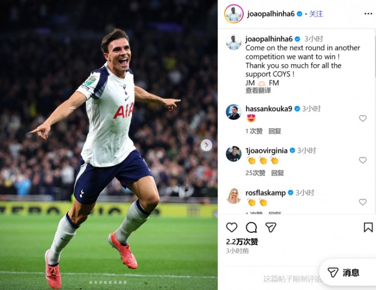 在外交媒体上,帕利尼亚写谈:在另外一个思要夺得冠军的赛事中,咱们闯进了下一轮。极端感谢热刺球迷们的搭救!