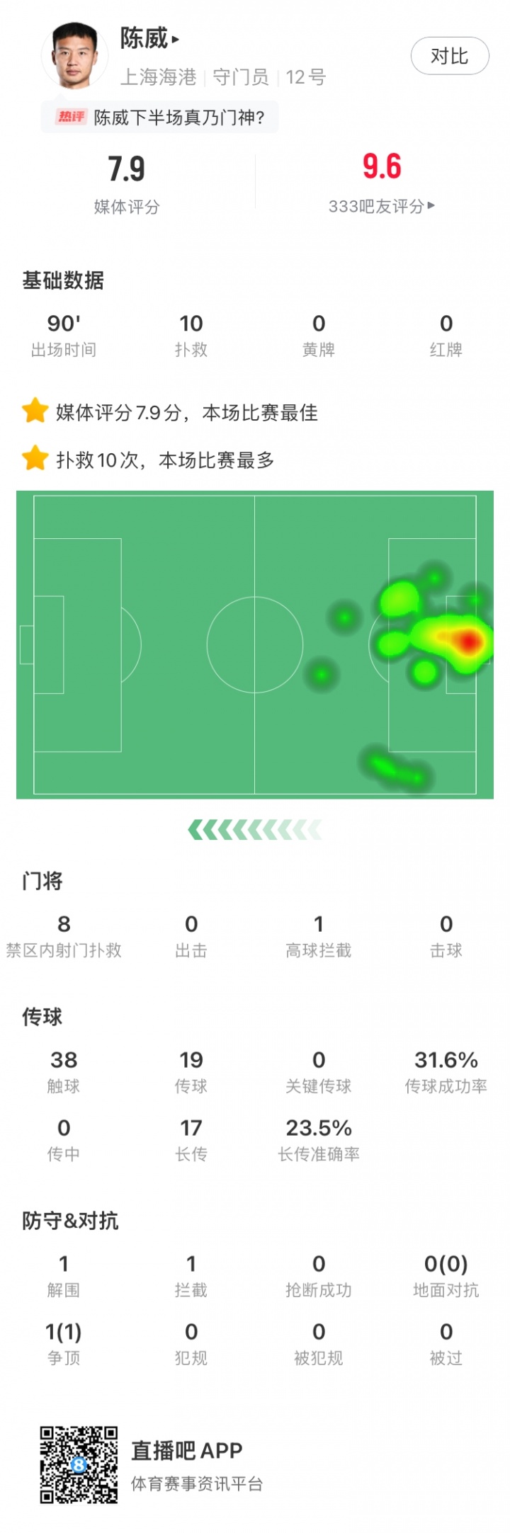 定海神针!海港二门陈威单场孝敬10次扑救,临了时分化解必进球
