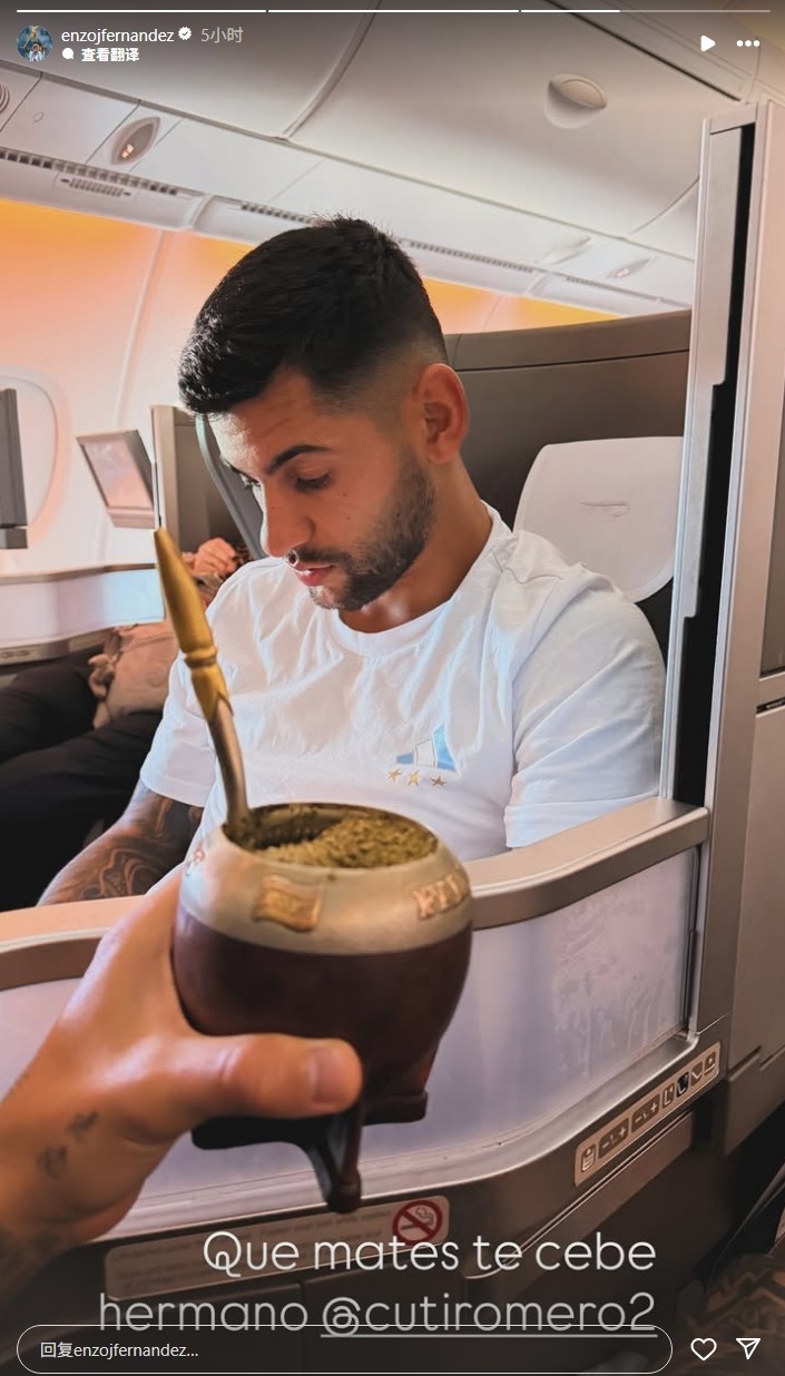 10月6日讯 切尔西中场恩佐-费尔南德斯在Instagram晒出和罗梅罗全部坐飞机归国度队的像片。