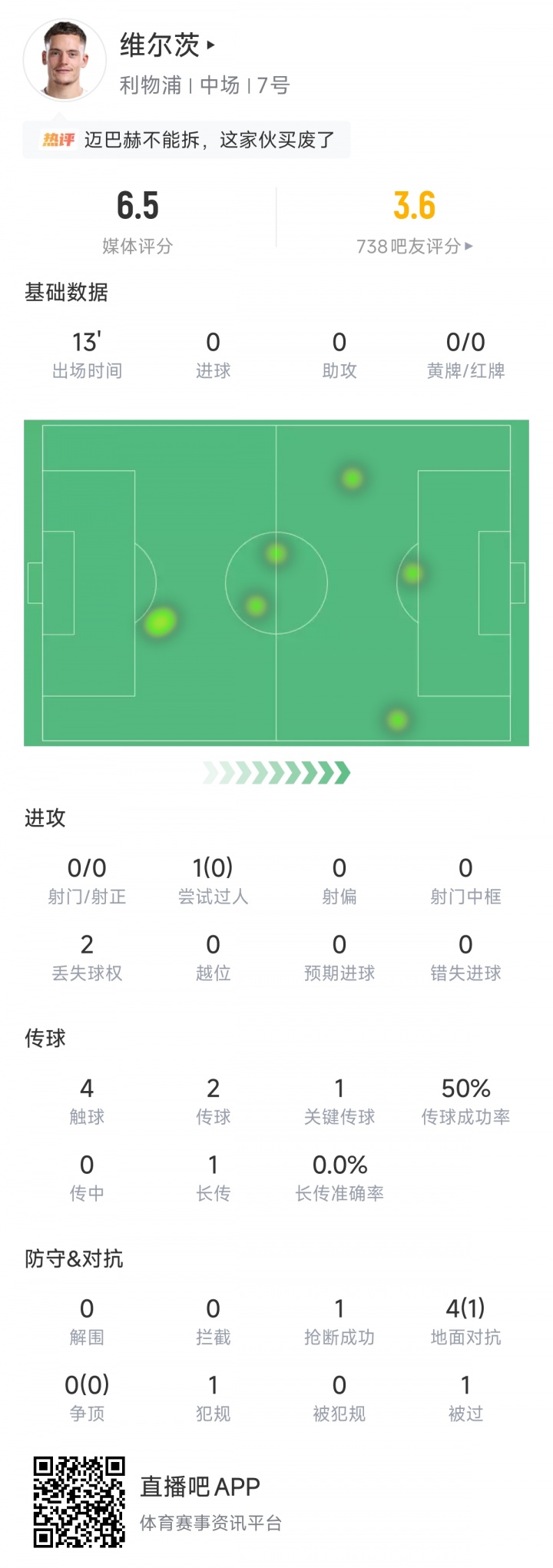 从第77分钟出场到伤停补时第4分钟规模,维尔茨一共出战17分钟,系数4次触球2丢球权,1次长传1次穿裆被过,4次反抗1得手。具体数据如下: