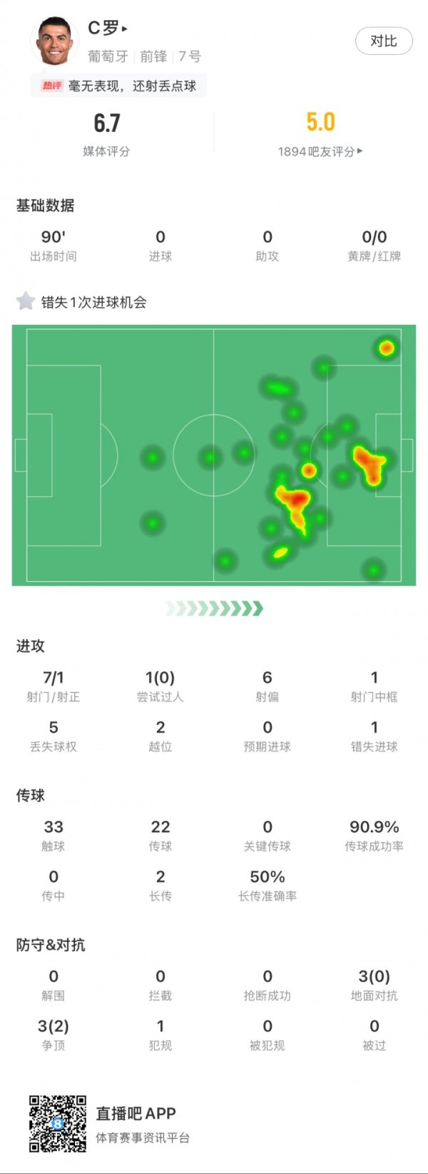 毕竟40了!C罗世初赛打满全场7次射门6次射偏,仅点球射正但失点