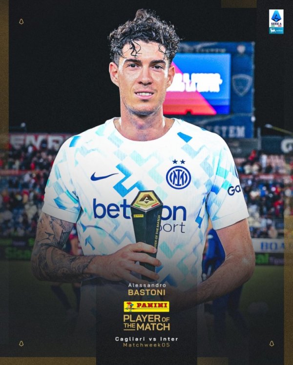 送出1次助攻!巴斯托尼当选国米2-0卡利亚里的全场最好球员