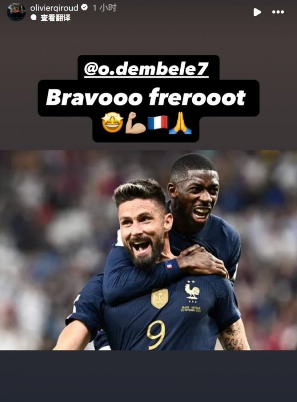 吉鲁社媒晒合影道贺登贝莱夺金球奖:太棒了,我的兄弟!