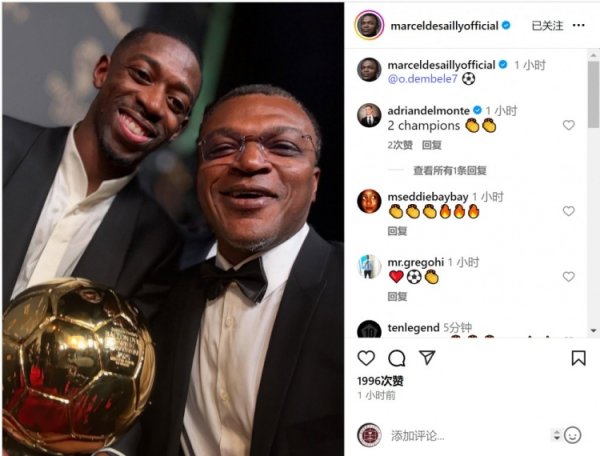 前辈的道喜!德塞利社媒晒与登贝莱合照