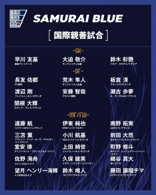 日本队友谊赛25东说念主名单:远藤航、三笘薰、久保建英在列,18东说念主旅欧
