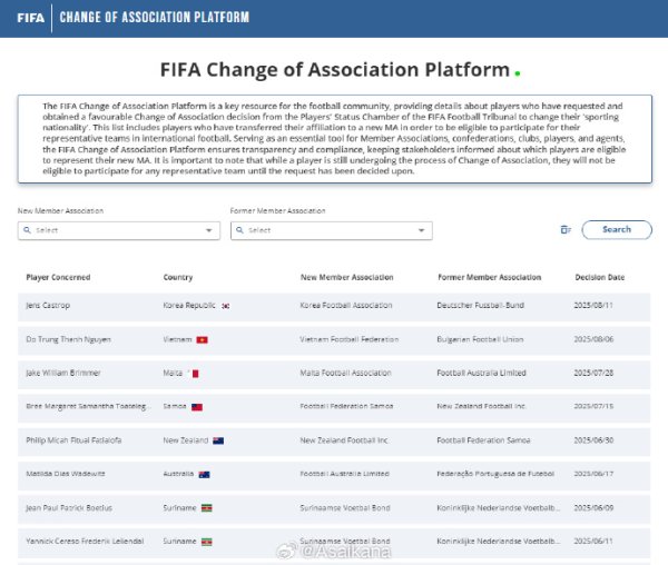 韩国完成卡斯特罗普的改变代表队手续,他今后将代表韩国队出战