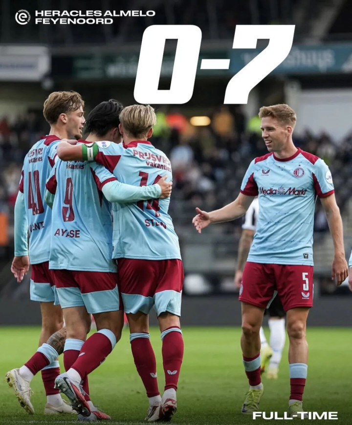 最终,费耶诺德在客场7-0狂胜敌手,以25分领跑荷甲积分榜。