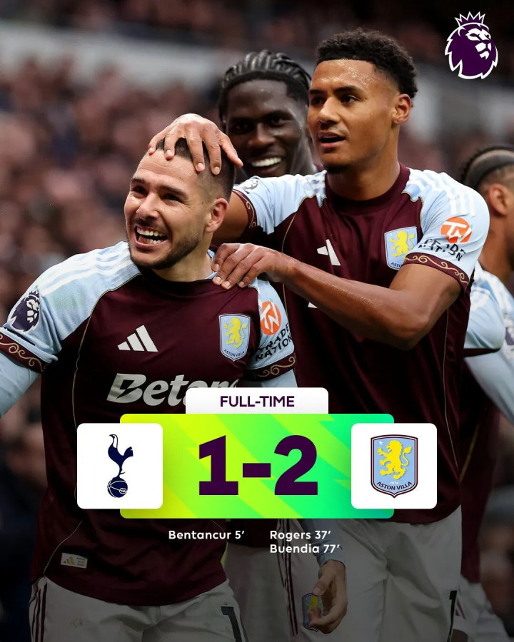 下半场,布恩迪亚远射破门,匡助维拉反超。最终,热刺主场惨遭维拉逆转。