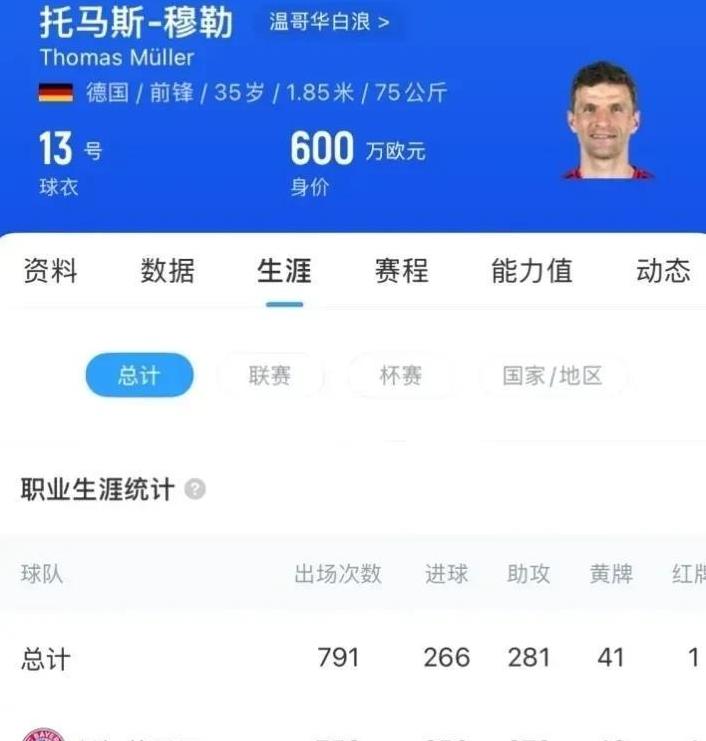 一东谈主一城的据说35岁的托马斯·穆勒,10岁就以天才少年的身份加入了拜仁慕尼黑,这25年来他一直皆在这家俱乐部,从来莫得离开过,几乎便是足坛里“一东谈主一城”的典范。到了2025年夏天,他的条约平静到期,透顶成为开脱球员。他在拜仁踢了756场比赛,进了250个球,还送出了276次助攻,数据相称亮眼。干事糊口中,他随着拜仁拿了2座欧冠、2座欧超杯、13座德甲、6座德国杯、8座德超杯,还有2座世俱杯,再加上2014年随德国队拿到的寰球杯冠军,所有这个词拿到了32座奖杯,荣誉多得数不清。在国度队,他也打了85场,进30球,十足是德国队的功勋级东谈主物,号称足球场上的“战神”!