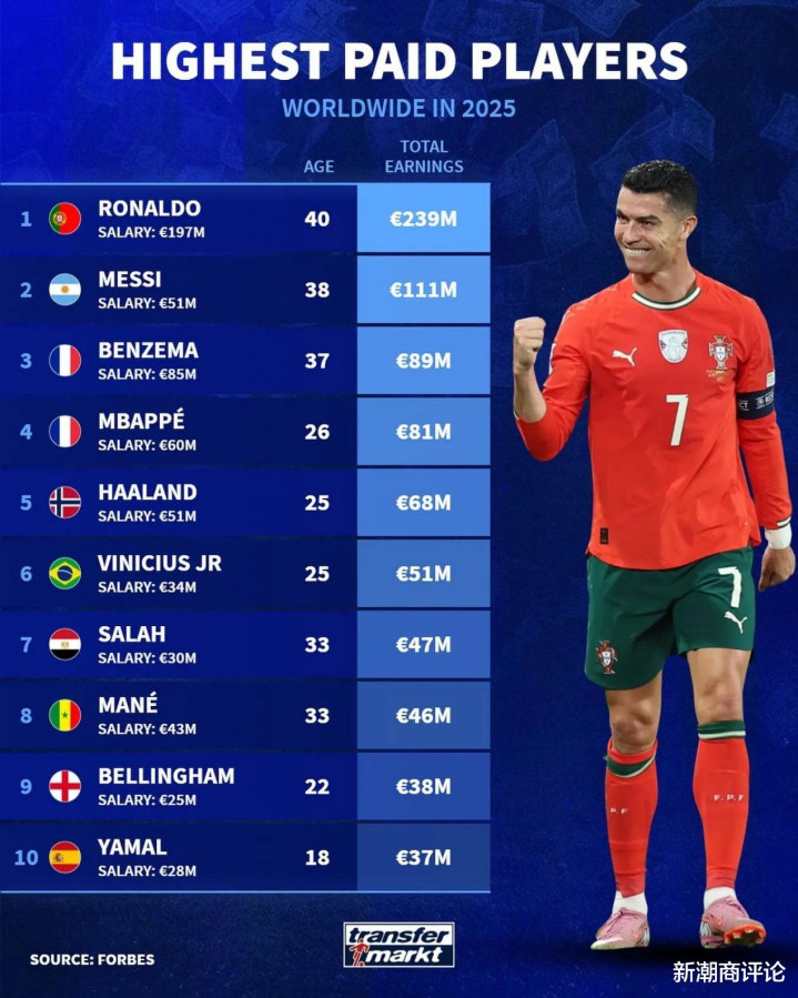 3名沙特联球员——利雅得到手的克里斯蒂亚诺·罗纳尔多(薪水1.97亿欧,总收入2.39亿欧)、萨迪奥·马内(薪水4300万欧,总收入4600万欧),以及吉达荟萃的卡里姆·本泽马(薪水8500万欧,总收入8900万欧)