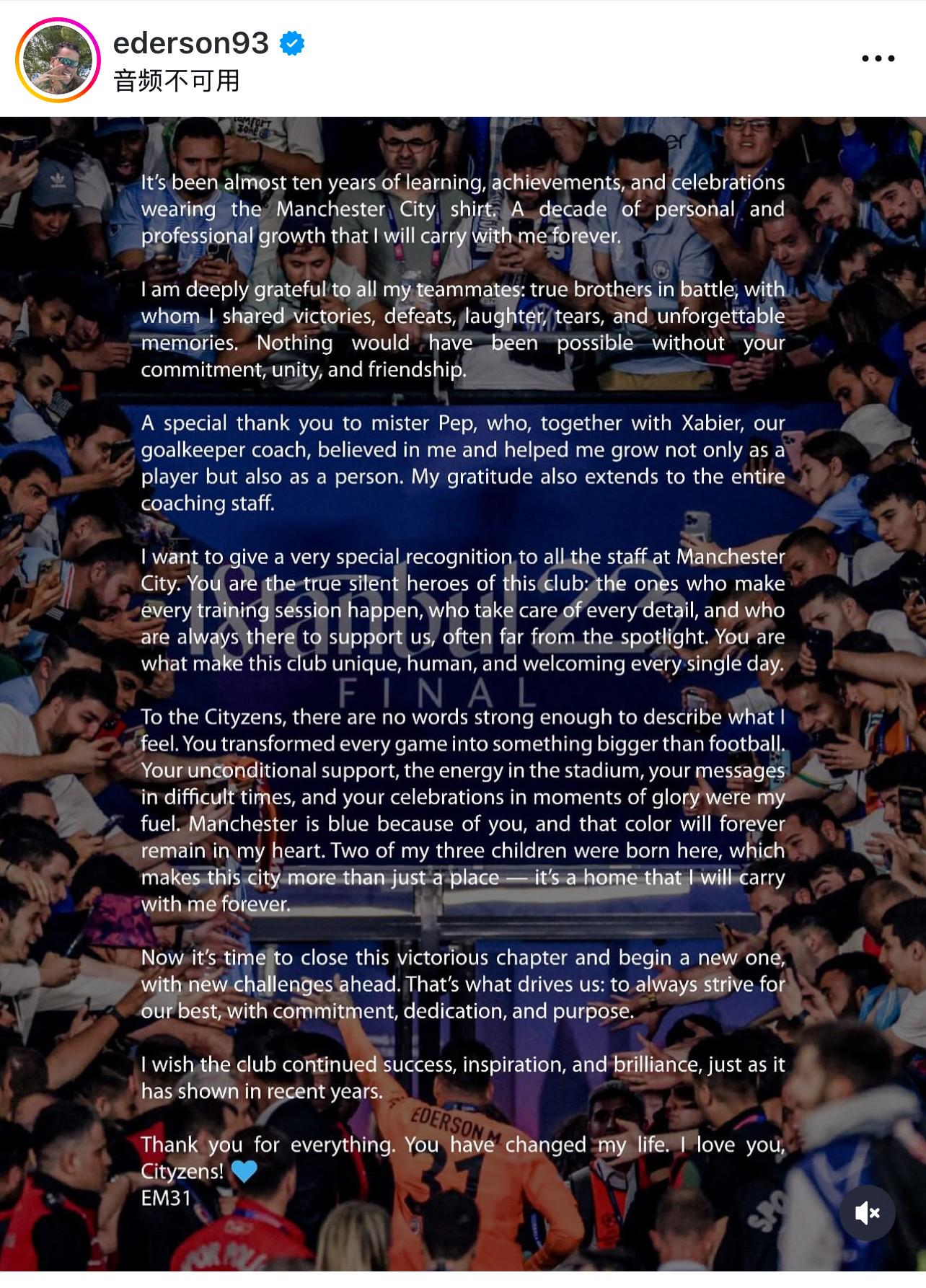 以下是埃德森告别曼城全文: