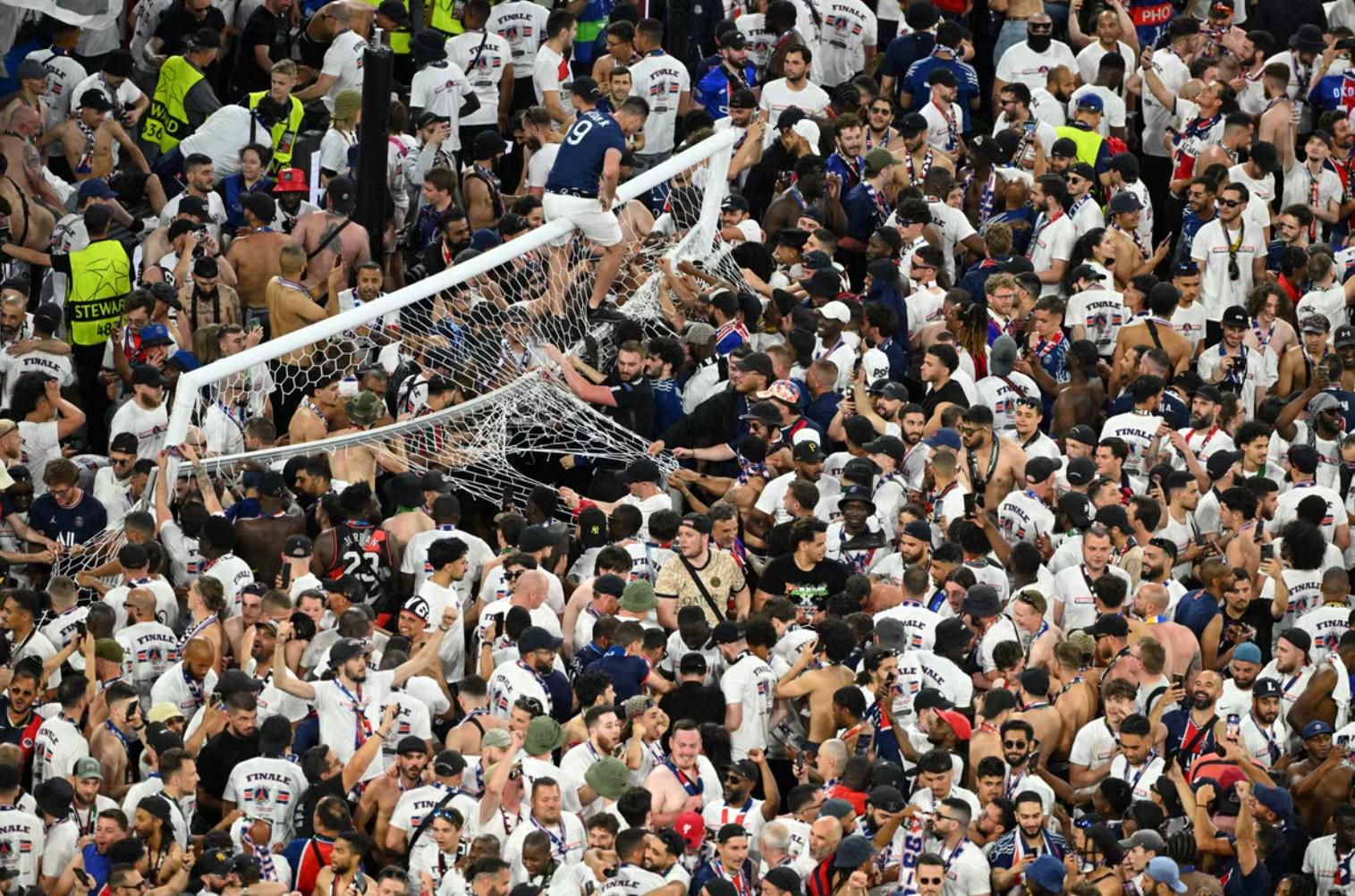 数千名巴黎圣日耳曼球迷在终场哨声响起后涌入球场,庆祝俱乐部初度夺得欧洲杯冠军,其中大批球迷从球门后方涌入场内,导致安保东说念主员难以保管步骤。