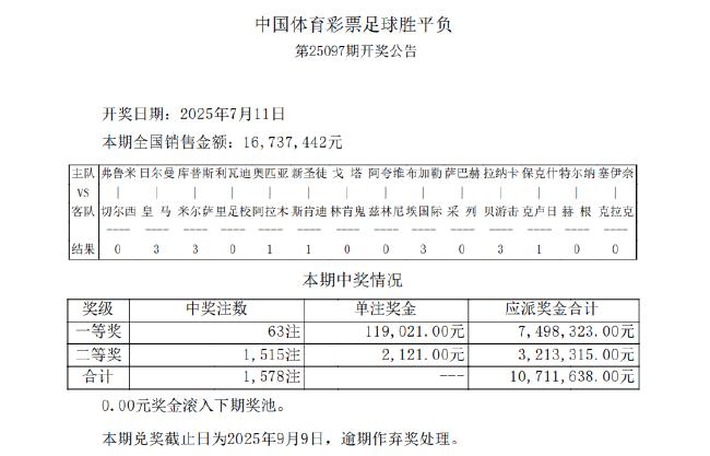 北京时辰7月11日,输赢彩第25097期开奖成果揭晓。本期头奖开出63注,单注奖金119,021元;二等奖开出1,515注,单注奖金2,121元;任九开出8,746注919元。本期输赢彩销量为16,737,442元,任九投注总数为12,570,674元。