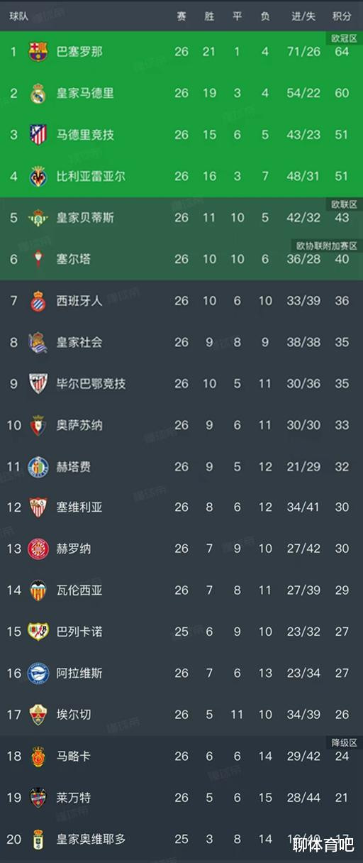 西甲最新积分榜