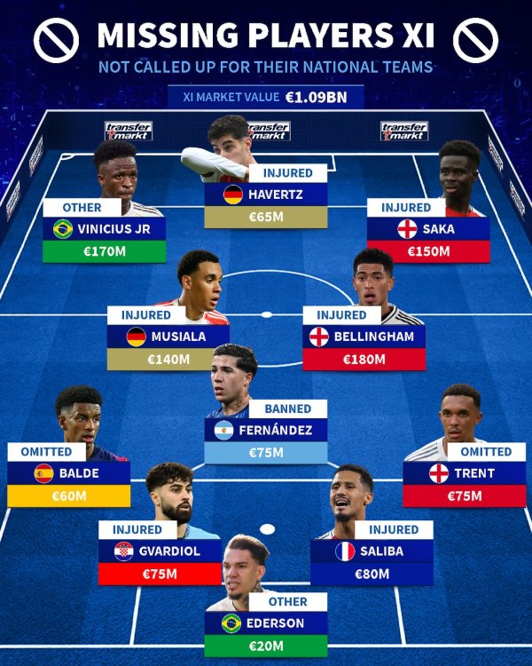 德转清点本月未获征召的球星: 维尼修斯、萨卡、穆夏拉在列