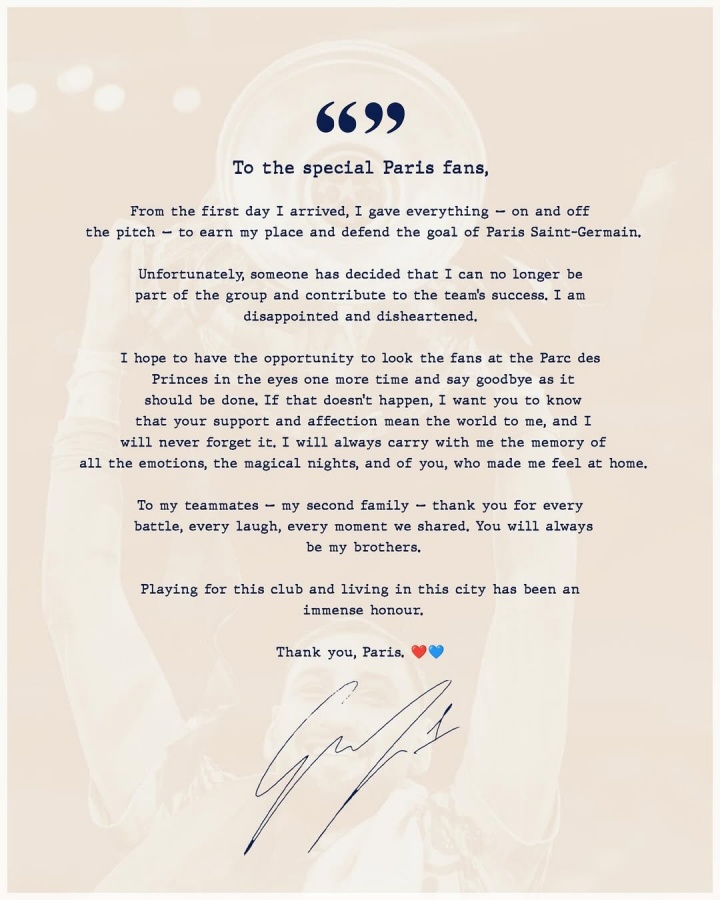 多纳鲁马告别信:有东说念主决定我不再属于这团队 但愿以应有姿色说念别