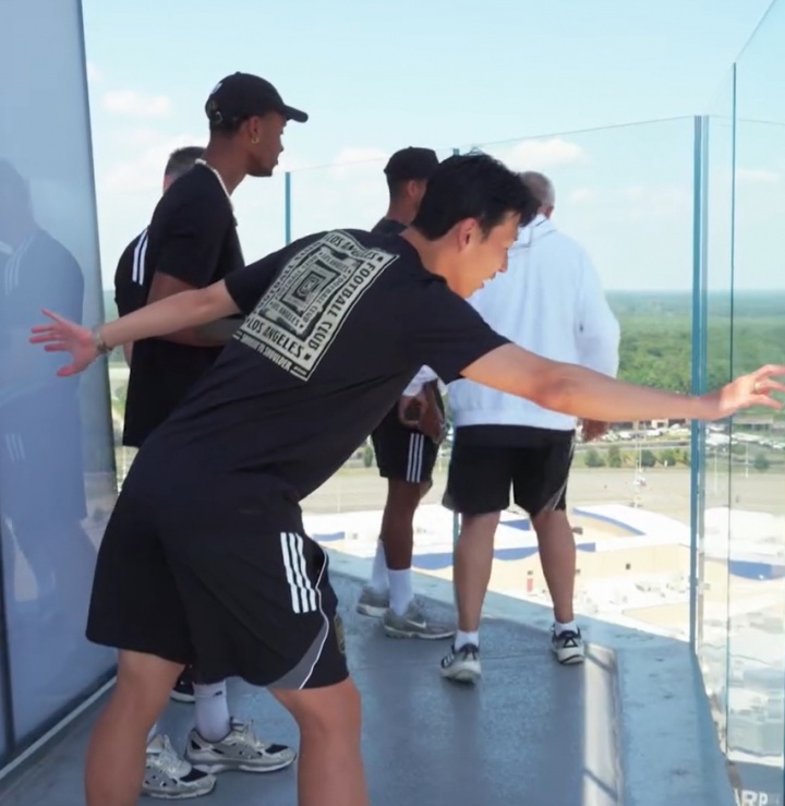 在赛前,洛杉矶FC官方发布一段视频。视频中球员和球队职责主谈主员在高处看吉列开通场。孙兴慜相配恐高,一直往后退,探着身子看球场。